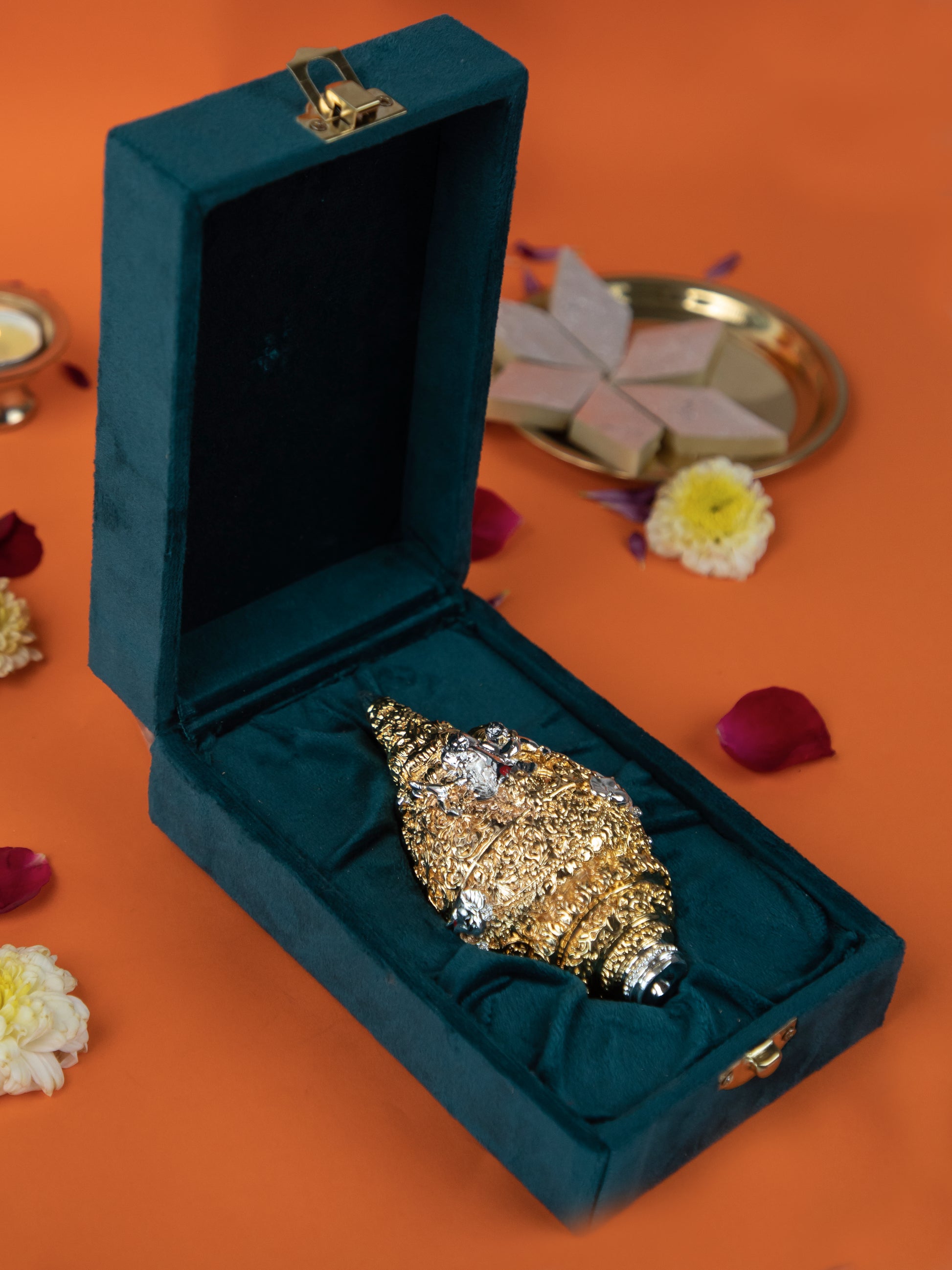 Invite divine blessings and elevate your space with this auspicious Golden Shankh in Velvet Box.