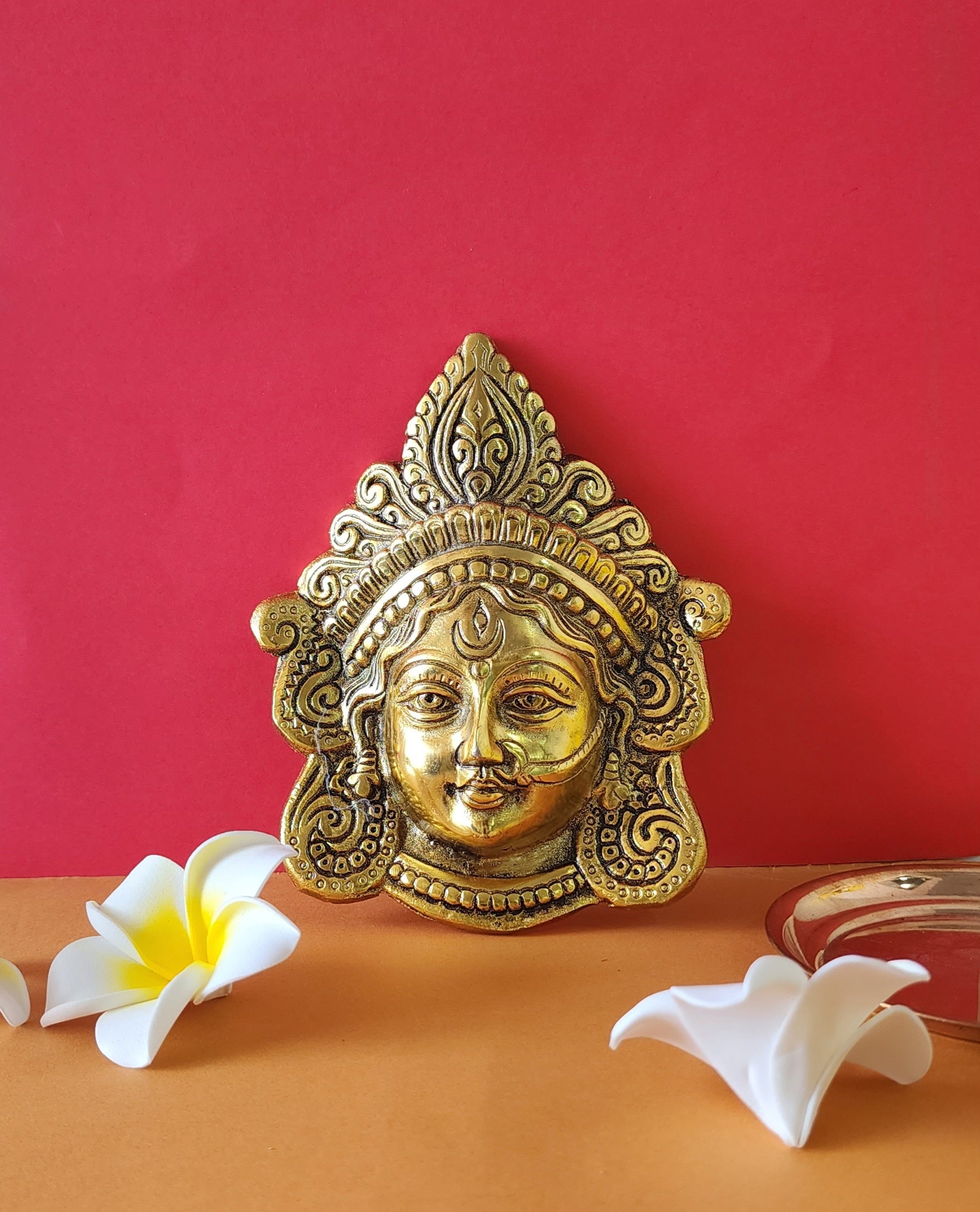 A divine wall mount featuring the intricate face of Durga Maa crafted from high-quality brass. This symbolic piece represents strength, protection, and feminine power, making it perfect for homes seeking blessings of peace, courage, and divine guidance.