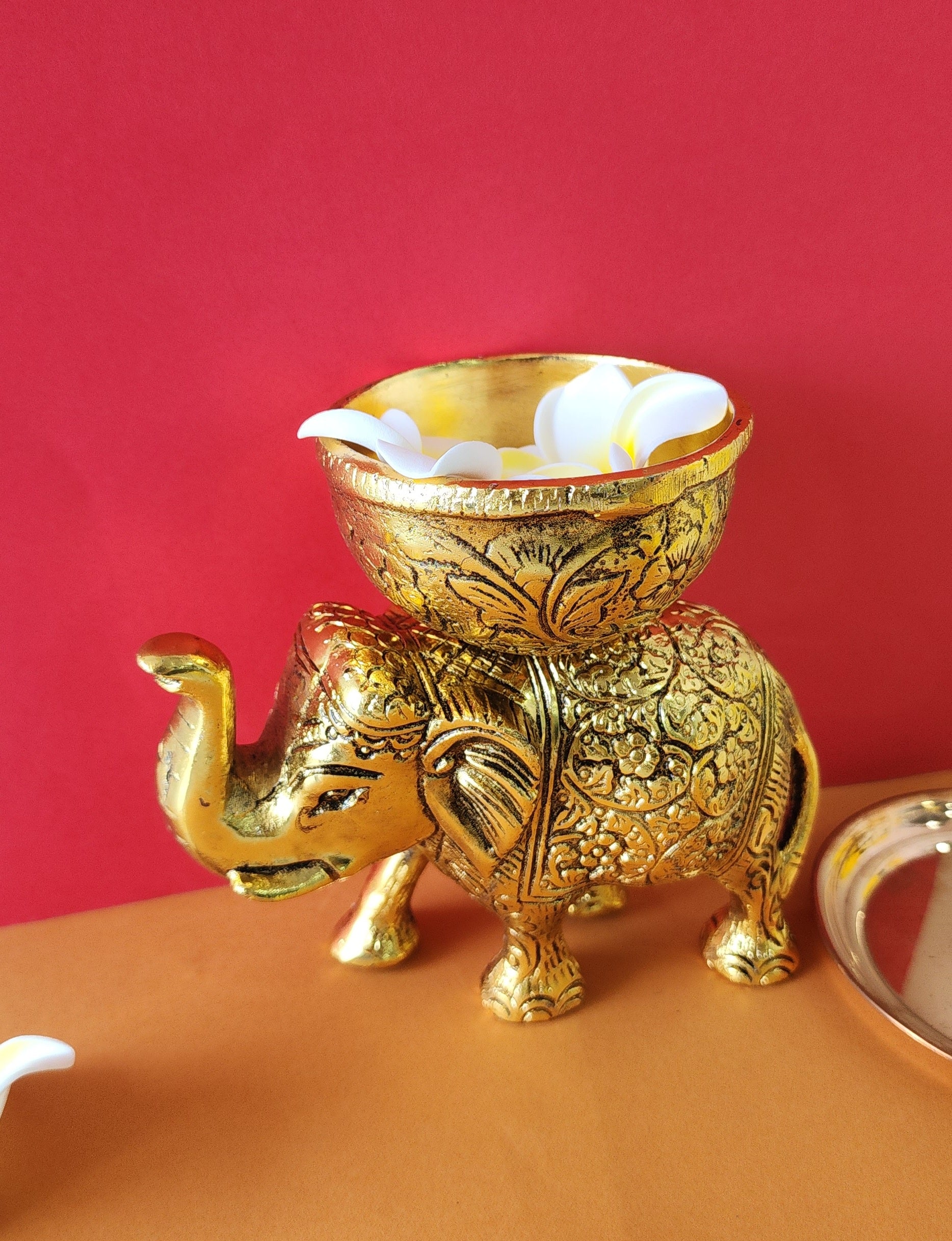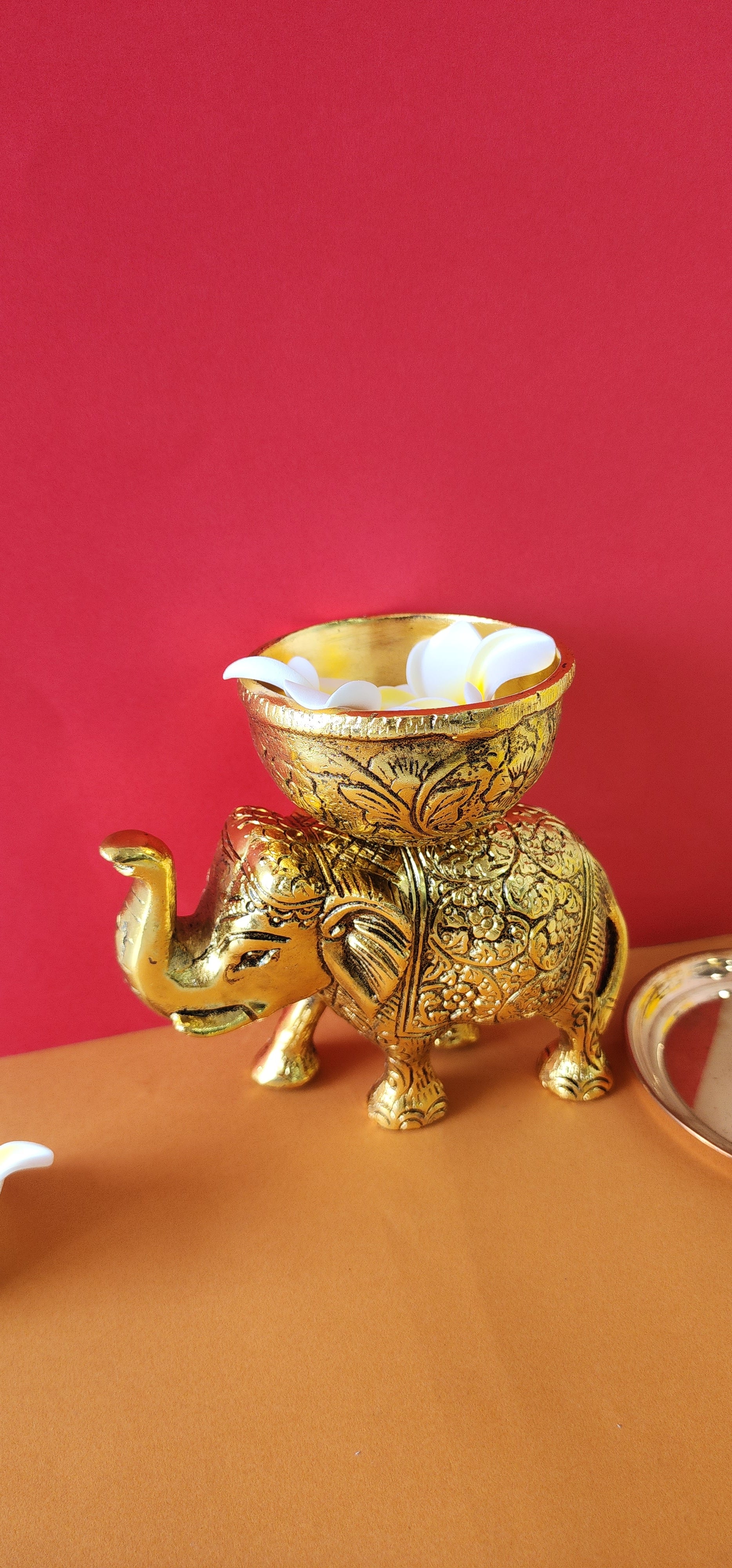 A unique showpiece designed like an elephant, serving as both a decorative piece and a functional dry fruit bowl. Crafted from high-quality materials, it adds elegance and cultural charm to any table setting.